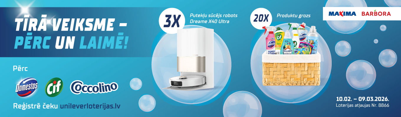 - Laika posmā no 10.02. līdz 09.03.2026. jebkurā veikalā Maxima vai interneta veikalā www.barbora.lv visā Latvijas teritorijā, iegādājies vismaz 1 (vienu) “Cif”, “Domestos” vai “Coccollino” zīmola produktu.